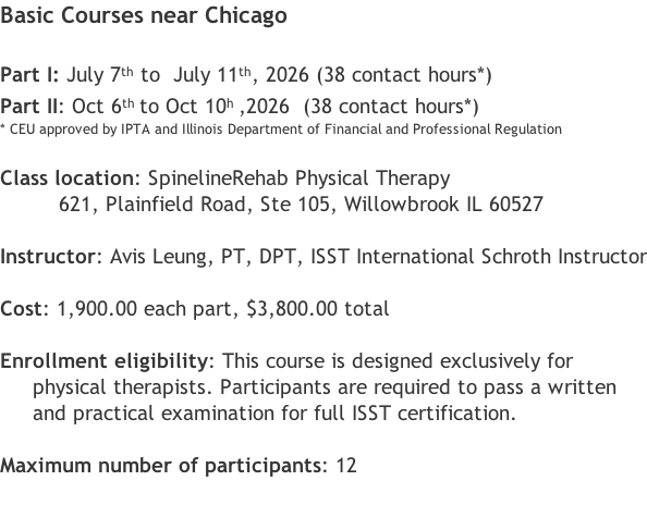 The complete certification includes two parts of 5 days each with a total of 77 continuing education hours. A written examination will be given at the end of part I and a practical exam at the end of part II. In between part I and part II course, therapists are encouraged to implement and practice the learned elements. Participants need to prepare 2 case reports for two different patients before part II.